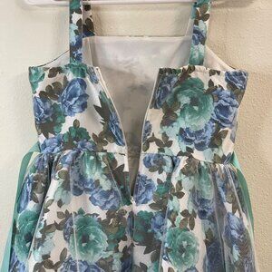 This dress features a sleeveless design with a high-low hemline adorned with a beautiful floral print. The delicate tulle overlay adds a touch of elegance, complemented by a sash and flower accent at the waist. The vibrant mix of green and blue hues creates a fresh, captivating look.