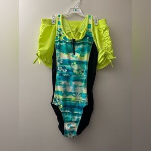 Vibrant floral swimsuit with a neon yellow shorts from zeroxposur Perfect for a day at the beach or pool. It’s like new, had to be washed but never worn. Girls size XL 16