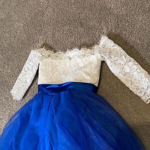 Girls Formal Dress Off the Shoulder Corset Back Blue & White with additional bow that you can either place on the front or back (or not on at all!)