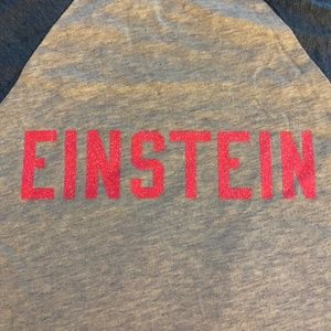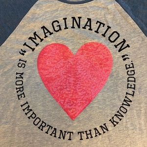 NEW with tag. Girls Gap Kids long sleeve t-shirt. FRONT: Einstein's "Imagination Is More Important Than Knowledge" quotation with sequined pink heart in the middle. BACK: The word "EINSTEIN in pink glitter. MATERIAL: 100% cotton. COLOR: Light heather grey body with a slightly darker heather blue sleeves. CONDITION: Brand New with tag. Just a bit wrinkled but can be ironed inside out to avoid damaging the print and sequence.