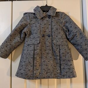 Stylish gray coat with a subtle navy bow pattern. Features a double-breasted design and a classic collar & lined hood. EUC, hardly worn.