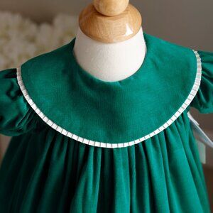 This Adorable Little Green Dress by Bailey Boys is a Classic!!! The dress in done in a gorgeous deep Green and is made of 100% cotton, pin wale corduroy- super soft and cuddly! The float style dress has an oversized collar that is trimmed in a beautiful ivory pleated satin trim. The short puff sleeves have a 1/2" matching corduroy band for a tailored look. The front and back top have a yoke, the back having a 2 button closure. The dress is lined with a white slip and has a small tier of tulle to add a touch of volume. PERFECT FOR MONOGRAMMING!! Great for transitioning into Fall/Winter seasons. Perfect little dress for Portraits, parties, church or other special occasions. Pair with a big white hair bow, white tights and black Mary Janes for a Classy, Traditional look!! Perfect little dress, NEW WITH TAGS!