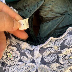 Missing buttons on the back closure, slight wear on fabric edges. Top to bottom = 28 inches, chest = 14 inches, waist = 12 inches.