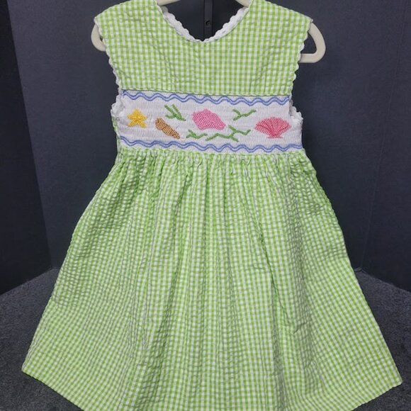 Green and white seersucker with the sweetest smocking of seashells and coral.
