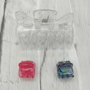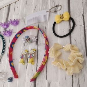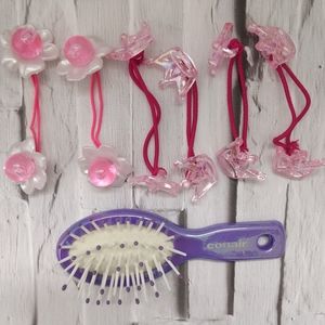 Large bundle of girls hair accessories. Includes headbands, barrettes, claw clips, hair ties, and mini comb and brush. Many flower, princess, and iridescent accessories, but please see pictures for exact items. All are in like new or very good condition. Great value!