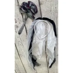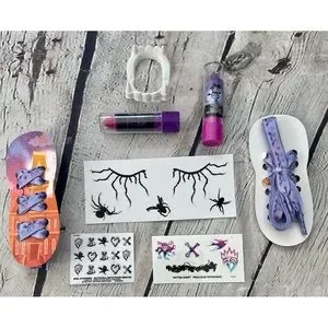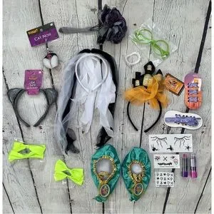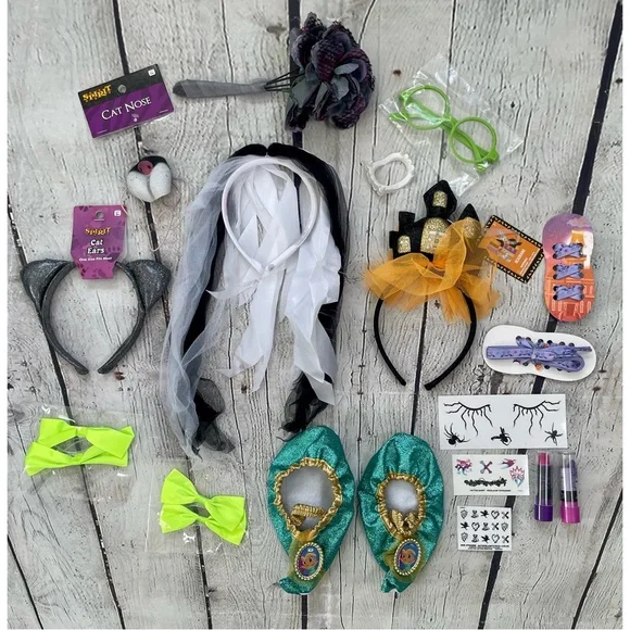 Girl’s Halloween accessory bundle includes: one haunted house headband, one cat ears headband, one cat nose, two pairs of Vampirina shoelaces, one pair vampire teeth, four neon hair clip bows, one pair green costume glasses, ghost bride floral bouquet, one ghost bride/bride of Frankenstein tulle headband, vampirina grape lip balm, wicked cool pink lipstick, shimmer & shine slippers ( toddler size ) one set of nail stickers, two sets of temp tattoos. All items are new new used. Ghost bride head band has spots of fake costume blood from being stored in Halloween box.