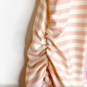 This striped bathing suit top has butterflies and flowers on the front and ruching on the sides.