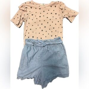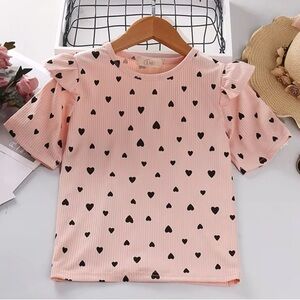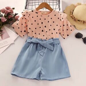 Adorable kids short outfit featuring a charming heart pattern. The pink and black design adds a playful touch to any outfit. Perfect for everyday wear.