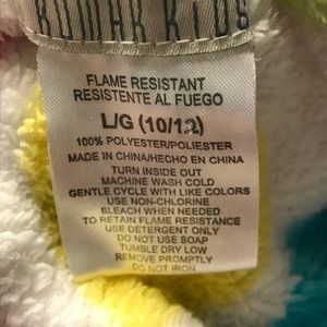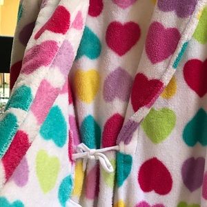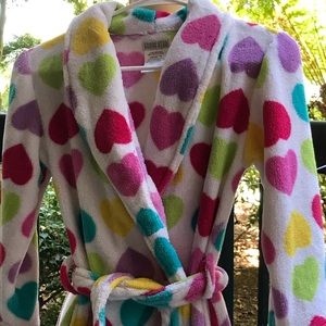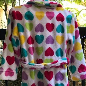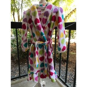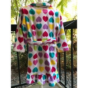 Sweet!! Hearts galore on this wrap rope. This fuzzy rope attached self tie belt, 2 pockets, long sleeves, and bottom ruffle. What young lady wouldn’t want to snuggle up in this robe? Excellent condition, almost like new.