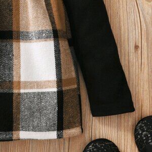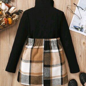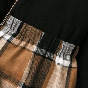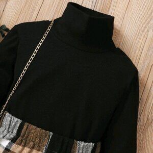 NWT Girls Black/Tan/White Long Sleeve Slight Stretch High Neck Tee & Plaid Skirt without Bag.
