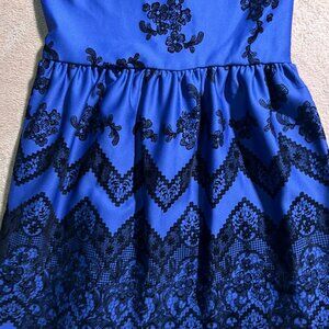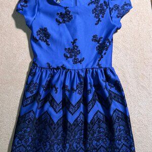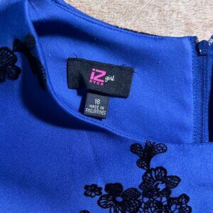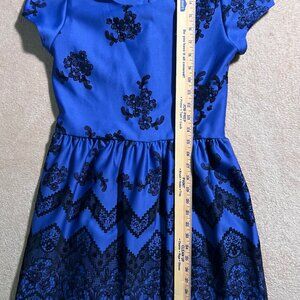 Girl's IZ Byer Sz 16 Sapphire Blue Black Velvet Floral Short Sleeve Dress (D)