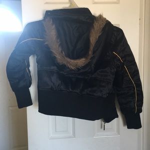 black puffy jacket with yellow gold line and faux fur trimmed hood