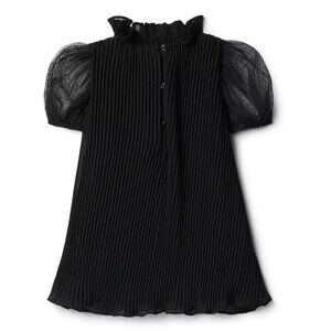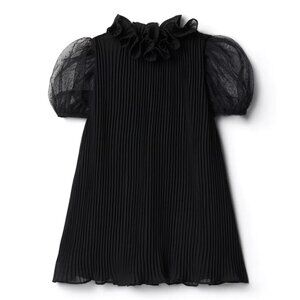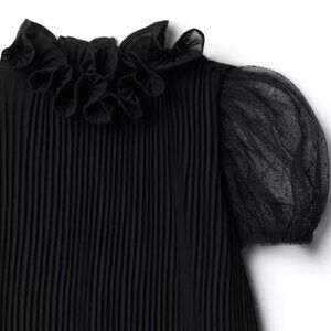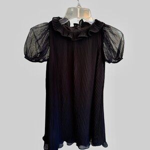 Go ahead, give it a twirl. With top to bottom pleats, a ruffled collar and sheer dot puff sleeves, this little black dress has all the makings of a classic.
