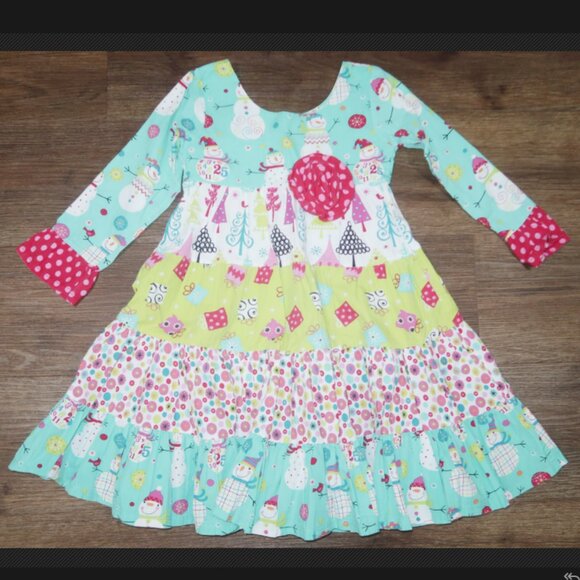 Super cute holiday dress! Ruffled tiers of cute holiday trees and snowman theme fabric. Buttons in the back. So cute and festive!