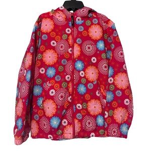 Floral print rain jacket. Very good used condition. No stains or signs of wear. Smoke free listing. Waterproof, breathable, wind resistant Soft lining 360° reflectivity tag for better visibility during low-light conditions. full-taped seams help seal out rain. Hand-me-down label inside to track each adventurer year after year.