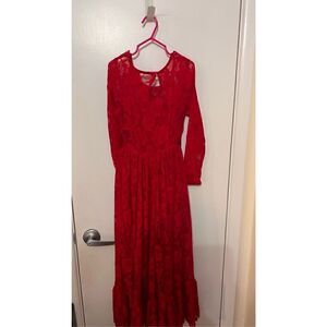 Girls Lace Long Sleeves Scoop Neck Belted Pullover Long Maxi Dress Red Sz 8-9Y