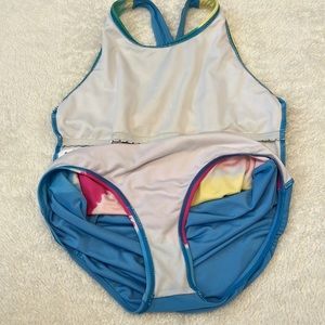 Girls size 14 Lands End one piece swimsuit in good used condition. Colors are still vibrant, elasticity is perfect, and bralette and inner liner are clean and stain free as shown. Generally modest cut with regular brief-style bottom and full coverage top. Back is blue with Criss-cross straps.