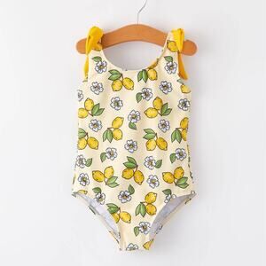 Features a fun lemon and floral pattern on a soft yellow background with adorable shoulder ties. Perfect for summer days at the beach or pool!