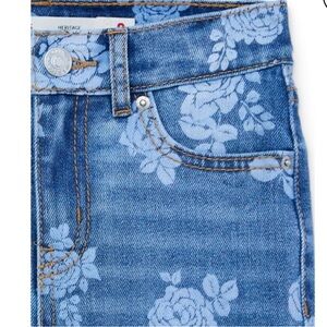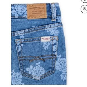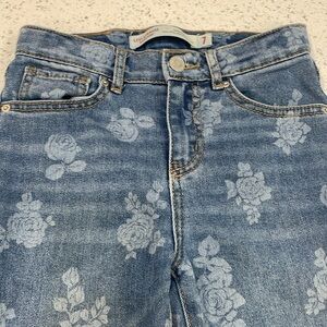 Levi's jeans featuring a white floral pattern on blue denim. Ideal for casual outings.