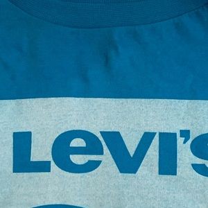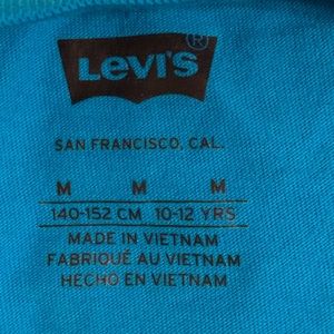NWT. Girls Levi’s Tee in a size Medium. I would say the color is a blue teal. Design on front. Fabric is 100% cotton.
