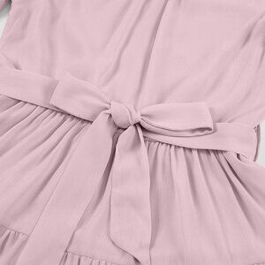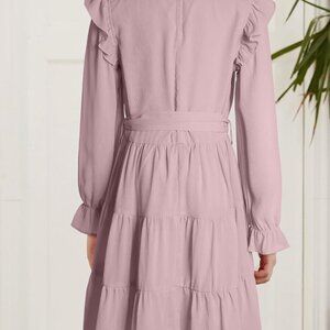 Features: Elegant tiered maxi dress with adorable ruffle sleeves and a classic round neckline. Comes with a matching belt to add a nicely shaped silhouette. Easy pull-on style with back button closure for hassle-free dressing.