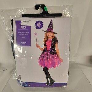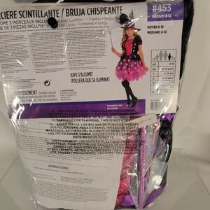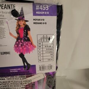Girls Light-Up Sparkle Witch Costume Medium (8-10) Dress Hat & Wand Purple Pink