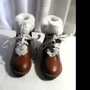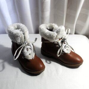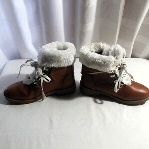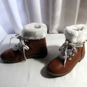 Girls brown Link booties with white plush accents, size 1