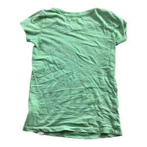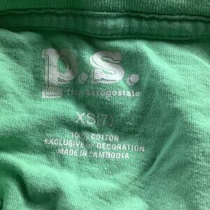 Lot of 2 girls' t-shirts featuring Gap's green striped pocket design and P.S From Aeropostale's "PSNY" graphic. Both have short sleeves and soft cotton fabric.