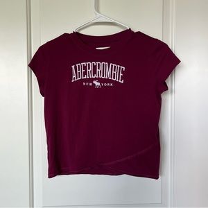 Description: Abercrombie Kids shirt. Maroon/burgundy color. Abercrombie New York wording on the front. Detailing on the bottom of the shirt.