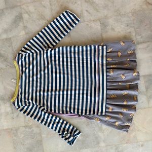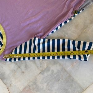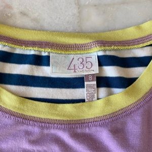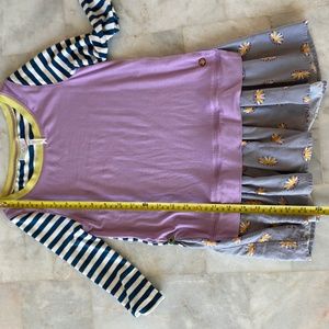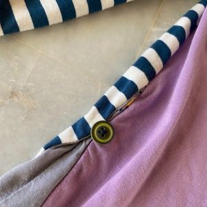 This barely worn, super cute Girl’s Tunic Top is by 435 from Matilda Jane and features a purple bodice, navy & white sleeves & back, lime green collar and grey floral hem. Cute button detail on sides and at sleeve cuffs. Super soft. Size 8. Very good Condition - one small snag on the back (see photos). See measurements in photos. No smoking house.