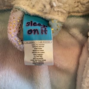 Supper soft and snuggly! Let her feel that her imagination reigns! Long sleeve and approximately knee length. Lined hood and around the front opening. Has the tie around the waist. Lite use. 10/12 girls