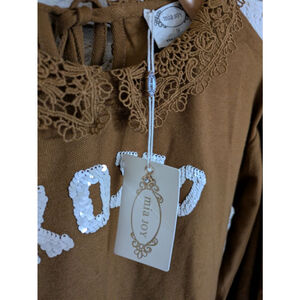 This is a Mia Joy dress, new with tags. The dress is a solid brown color with long sleeves and a lace collar. The front of the dress has the letters "XOXO" in white sequins. The dress has a tie at the back of the neck. The size is 14. The dress is in new condition with no visible imperfections.