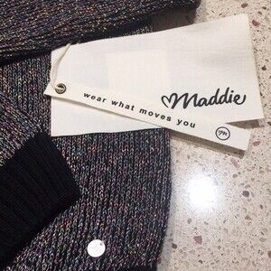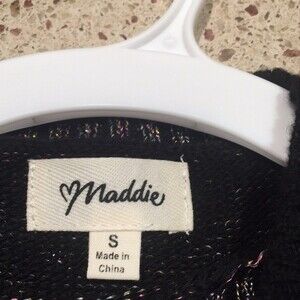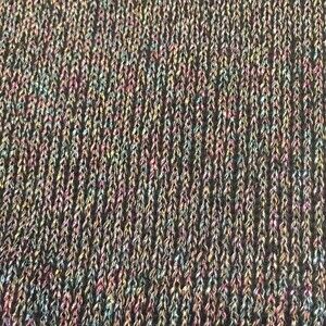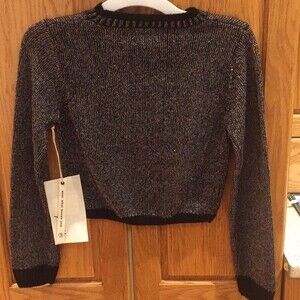 Black with multi colored threads throughout. Cropped—15” from neck to hem.