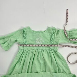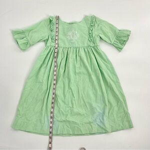 Girls Natalie Grant Dress Mint Green Thin Corduroy Monogrammed “C” Dress size 5. 3/4 ruffle sleeve light green monogrammed initial C on front. Has 3 button back. Does have some faint discoloration spots on the hemline. See last photos.