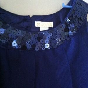 This dress is GORGEOUS! This dress is navy blue, has sequins and beautiful ruffles and curls. This dress was only worn once and is still as good as new! This dress is perfect for a fancy occasion or holiday. It has such elegance!