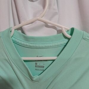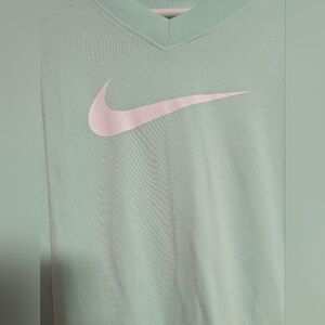 Girls Nike light mint green Nike tee featuring a bold white swoosh. It is a Dri-fit material. Size medium, which is a girls size 10/12. In excellent condition.