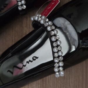 Step out in style with these elegant black Nina dress shoes, featuring exquisite pearl and gem detailing. Perfect for outings and the Holiday's! New with tags, size youth girls 1