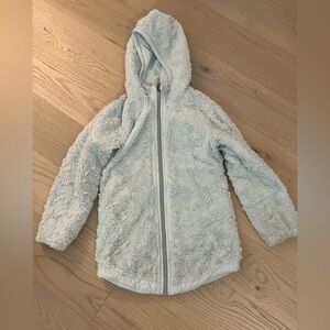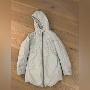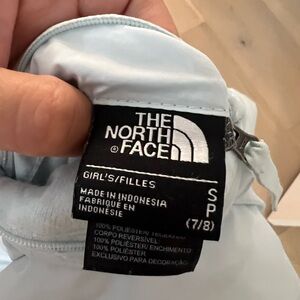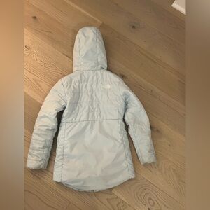North Face Girls Winter Jacket - one side is quilted and the other side is very soft fleece. Hood is attached and the length is longer and hits mid thigh. Good used condition - may need some spot cleaning but lots of life left! Size Small 7/8.