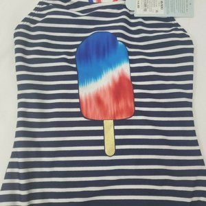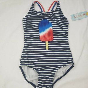 This blue and white striped one-piece swimsuit has a red, white and blue popsicle on the front and red, white and blue straps that come together to create a racerback fit.