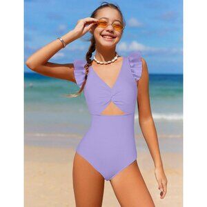 Girls One Piece Swimsuit Cut Out Ruffle Bathing Suit Twist V Neck