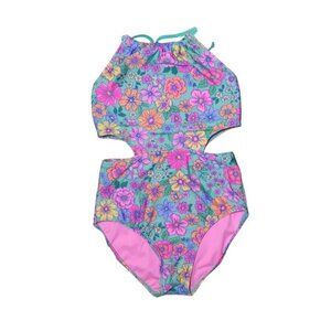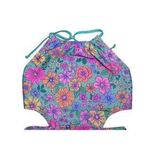 This vibrant swimsuit blends fun and functionality. Crafted with recycled polyester and spandex, it features a bold floral print and unique cut-out design. The halter neckline ties for a comfortable fit, while pink and green accents complement the cheerful pattern. Designed for swimming and sunbathing, it offers both style and eco-conscious appeal. NWT