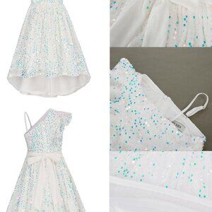 Features: This shiny sequined dress features an adorable asymmetrical high-low hem that adds a fun, fashionable twist. The one-shoulder strap is decorated with ruffled edges, giving it extra charm. Detachable and adjustable shoulder straps, along with a hidden back zipper, make for easy dressing. It also includes a fixed velvet waist belt that can be tied in the front or back, perfect for customizing the look.