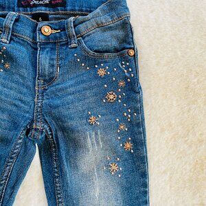 This girl's outfit in size 6 includes a pair of Jordache bejeweled distressed jeans and a custom-made tasseled fringe tank (Cherokee brand) in a peach color. The jeans feature functional front and back pockets, snap and zip-fly closure, belt loops and an adjustable waist. The rhinestones on the front are a peach/rose gold color and the embroidery is a cream and metallic rose gold. The distressed jeans and trendy fringe tank make it a stylish choice for summer or spring. So cute!