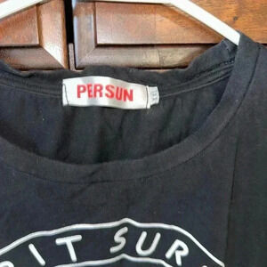 Pre-owned black cotton blend t-shirt by Persun. Features a graphic print with a yin-yang symbol and geometric designs, and black fringe along the sides. Short sleeves and crew neck. Measurements: approximately 16" wide and 18" long. The shirt shows minor signs of wear, consistent with previous use. No significant stains or tears are visible besides a slight discoloration on the back which is shown in photos. XXL Girls
