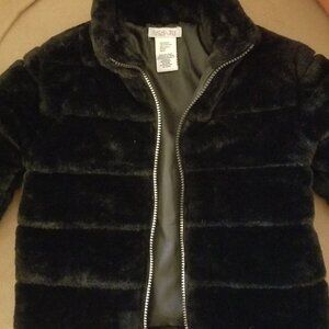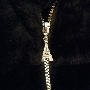 1 Rachel Zoe Black Faux Fur Teddy Jacket that is hip length, high collar, with a beautiful silver crystal eiffel tower zipper.