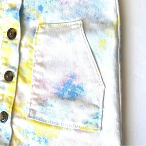 Girls 4T Wonder Nation pastel color paint splash pattern overall dress with front button closure, button adjustable shoulder straps and side pockets. 74% Cotton/24% Recycled Polyester/2% Spandex. Gently Loved. Excellant Condition.