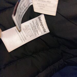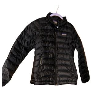 Girls Patagonia black puff jacket size M size 10 youth kids. Preowned . Comes from smoke free home. There is a flaw. The left front pocket does not zip up do to snag on pull tag zipper part ( see last 2 pics) .