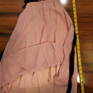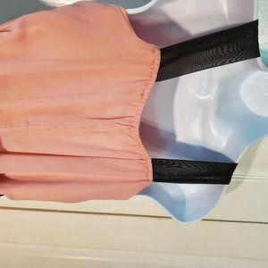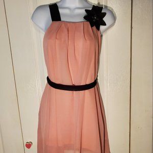 Girls Chiffon Dress Size 10 Peach with Black Accents. Black Sleeveless Straps, Belt and Beaded Flower at bottom of left strap. Over-the-shoulder straps. KIDDO by Katie. Chiffon over full lining. Purchased new for my daughter and only worn once or twice. I don’t see any flaws 29” from top of strap to bottom of hem..