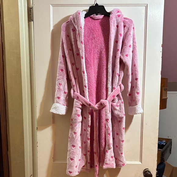 Cozy pink robe with heart patterns. Features a hood and belt tie. (Would fit any teen girl!)