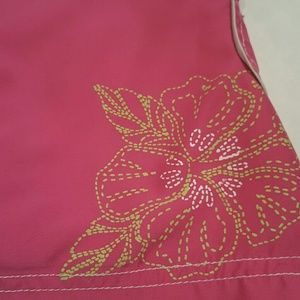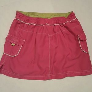 Super cute pink skirt. 100% polyester with a short underneath that is 95% cotton / 5% spandex. Pockets on the sides. Back of waistband is elastic with a shoestring tie in front. Used condition. Size 8-10